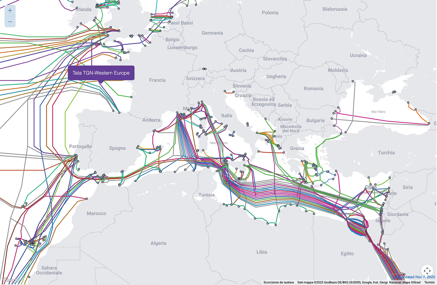 Ecco perché questo nuovo reticolo di fibre, completamente invisibile alla maggior parte delle persone, sta ridisegnando l’importanza della penisola. Non è più la storia dell’Italia “ponte tra Oriente e Occidente” raccontata nelle scuole, non è nemmeno nostalgia o retorico orgoglio italiota: oggi quel ponte è reale, concreto, fatto di fibre ottiche che viaggiano sotto centinaia di atmosfere di pressione. E ogni volta che premi play su Netflix, mandi una PEC, apri una cartina su Google Maps o leggi queste righe, una minuscola parte di questa infrastruttura passa davvero da lì, dai cavi sottomarini e dalle coste italiane.